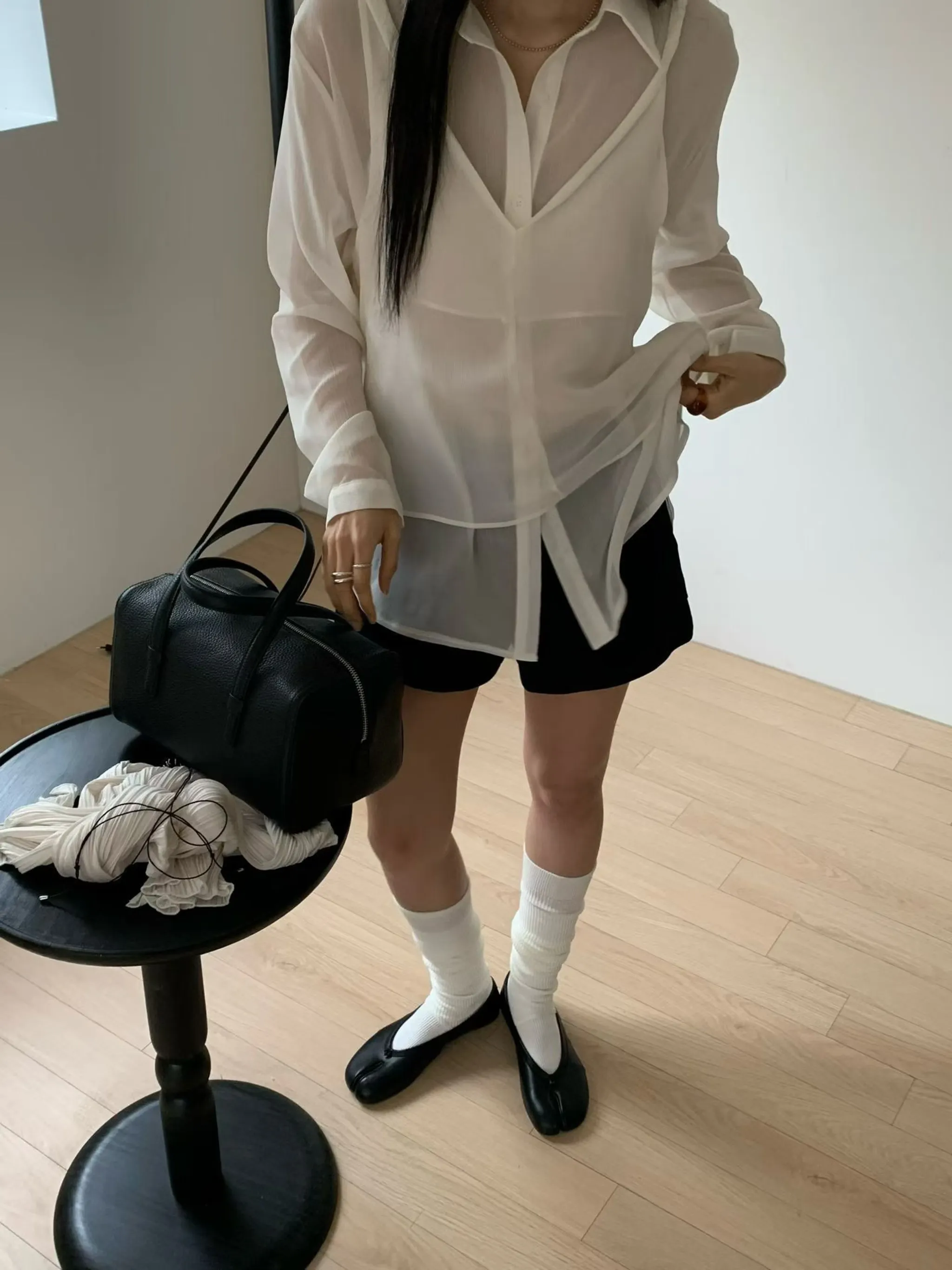 經典微透雪紡長襯衫(同色小腰帶)