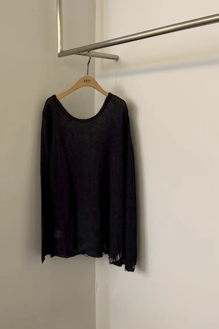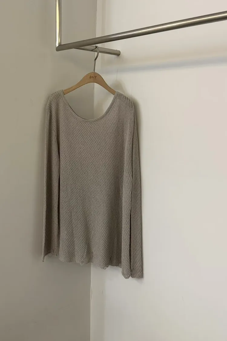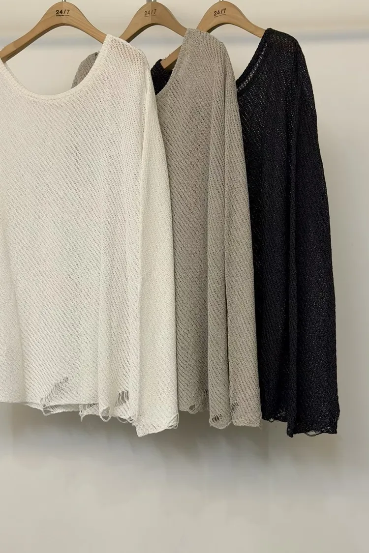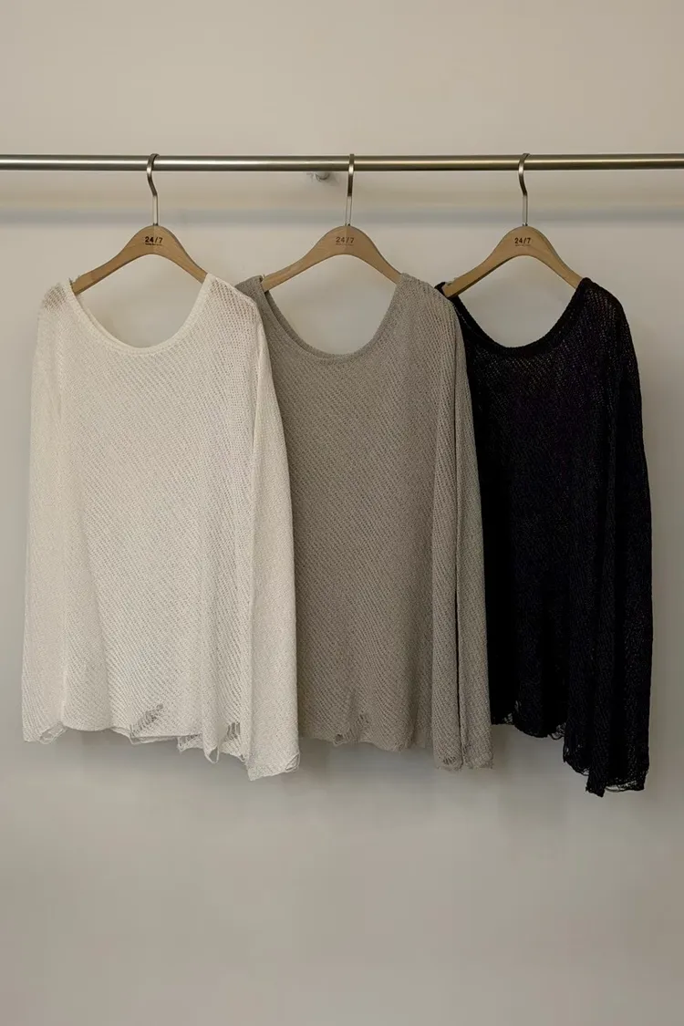 這就是我們要找的那件「穿上去就不想脫下」的慵懶神衣 大大的圓領剛好露出鎖骨線條,搭配寬鬆的落肩設計,把那份不經意的慵懶質感發揮到了極致 ✨ 妳會愛上的細膩亮點: 空氣感鏤空:細密的網格織法,透氣性極佳,非常適合台灣 4 月微熱的天氣。內搭一件 Bra Top 或細肩帶洋裝就美得不像話 隨性破壞細節:下擺與袖口帶有細微的抽鬚破壞感,打破了針織衫的單調,增加了一份