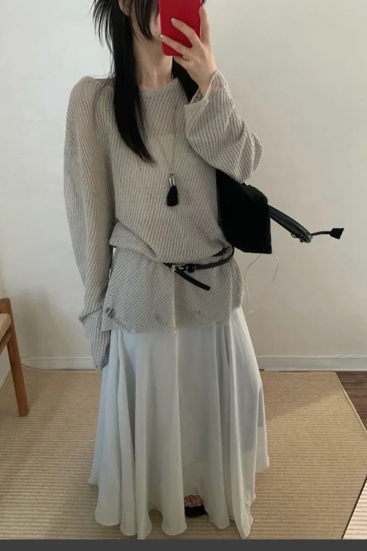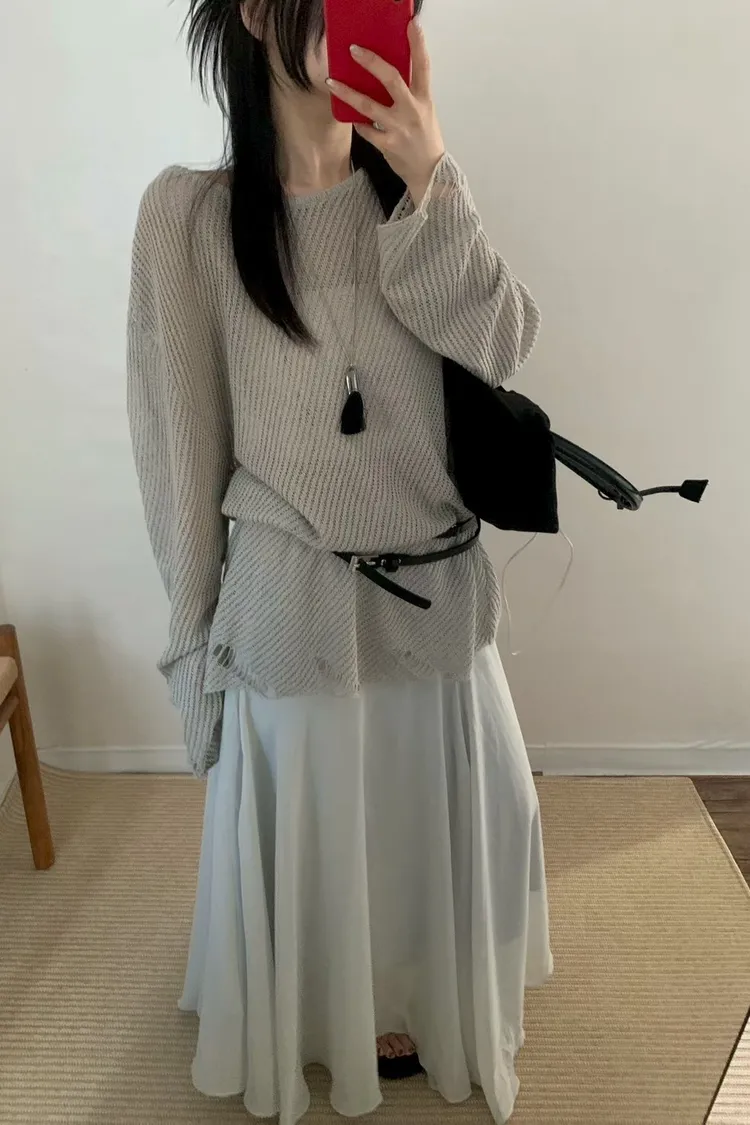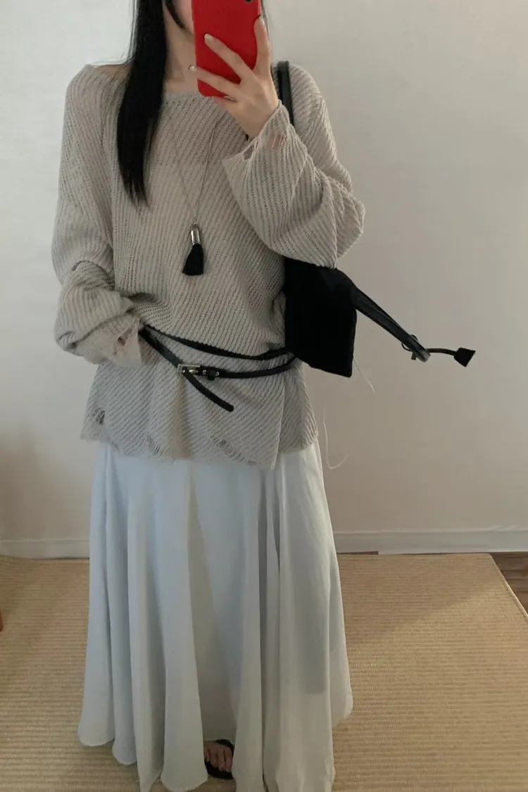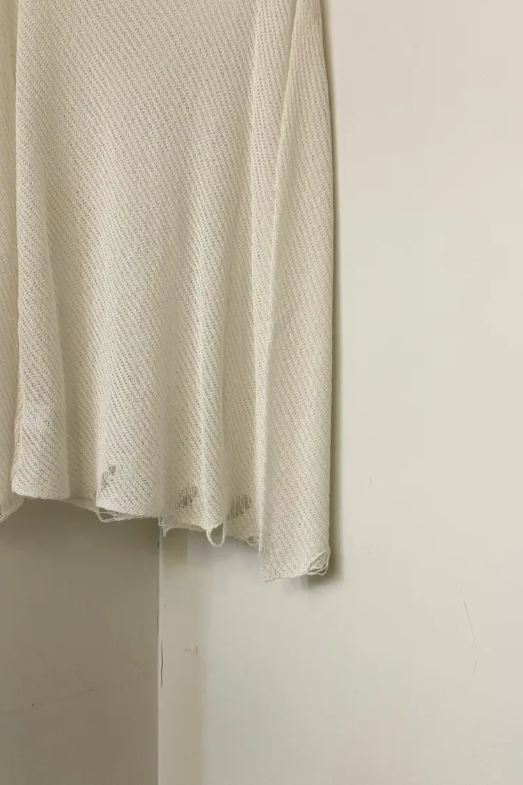 這就是我們要找的那件「穿上去就不想脫下」的慵懶神衣 大大的圓領剛好露出鎖骨線條,搭配寬鬆的落肩設計,把那份不經意的慵懶質感發揮到了極致 ✨ 妳會愛上的細膩亮點: 空氣感鏤空:細密的網格織法,透氣性極佳,非常適合台灣 4 月微熱的天氣。內搭一件 Bra Top 或細肩帶洋裝就美得不像話 隨性破壞細節:下擺與袖口帶有細微的抽鬚破壞感,打破了針織衫的單調,增加了一份