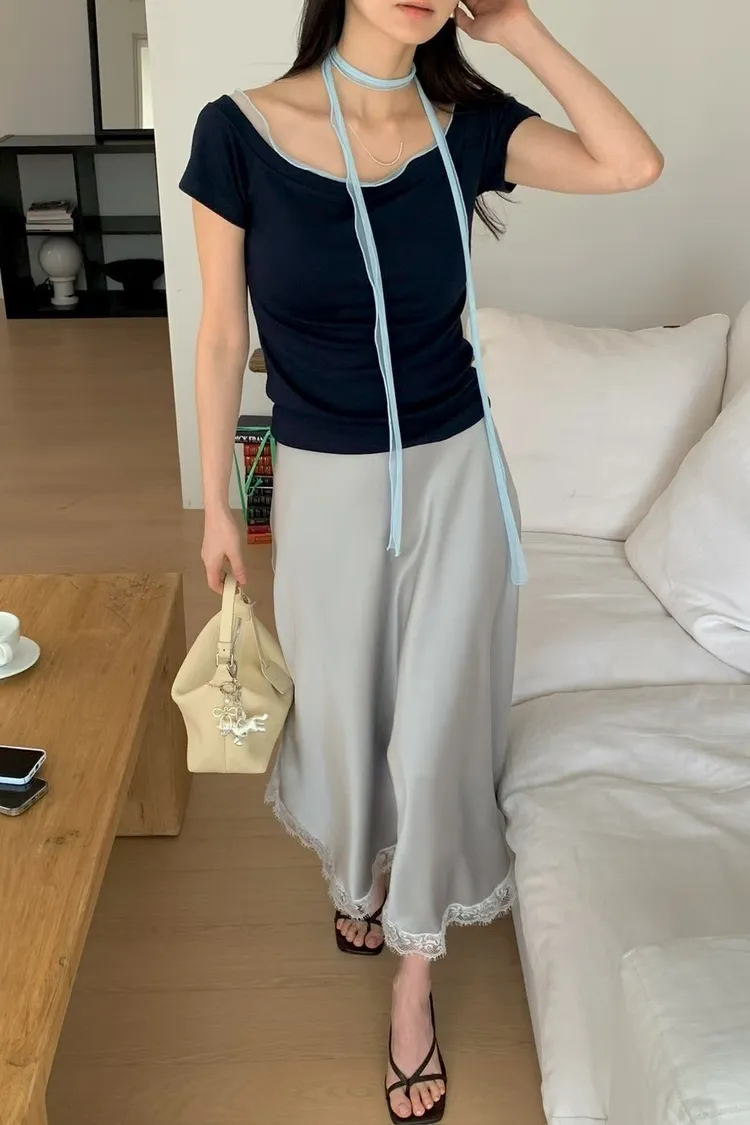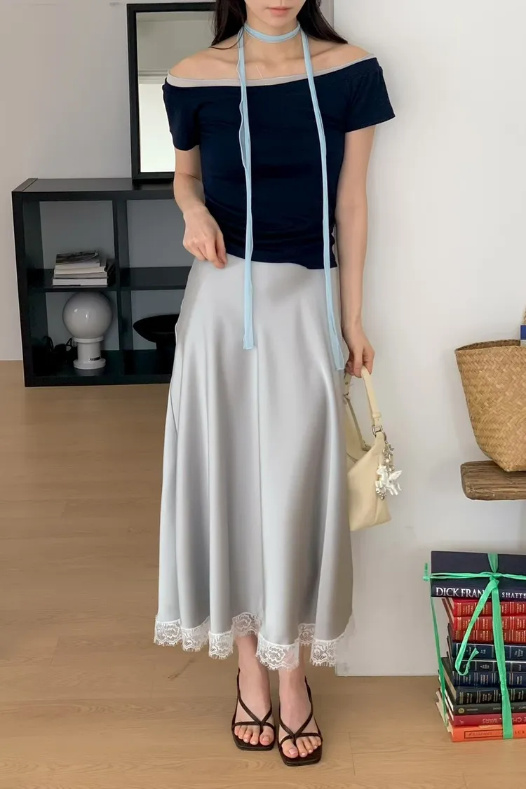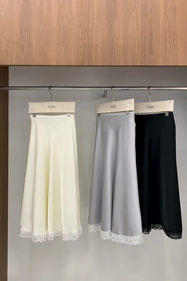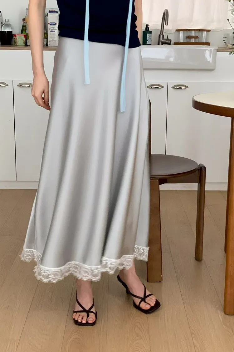 我們挑選了這款帶有微光緞面質感的長裙,最迷人的地方在於裙襬處那一圈精緻的睫毛蕾絲,讓優雅在每一步走動間若隱若現
