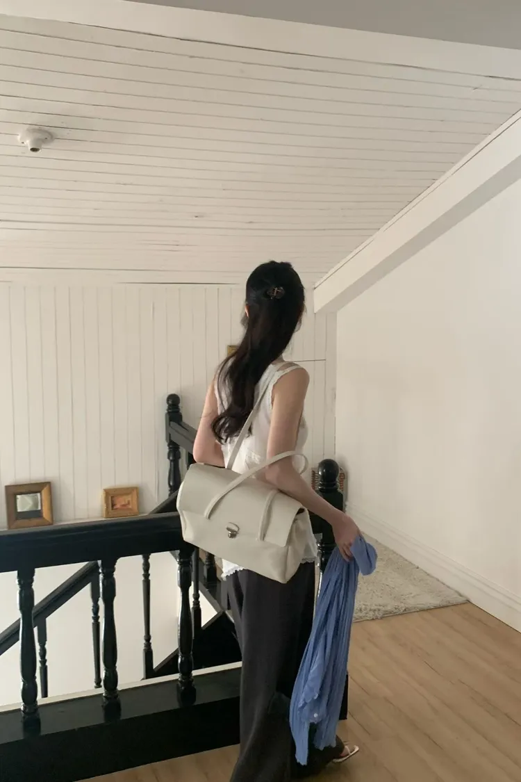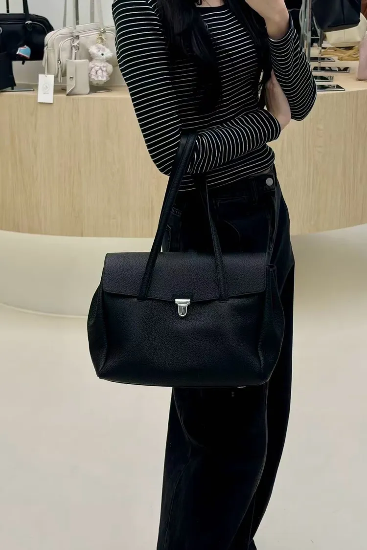- 精緻五金扣鎖: 正面採用獨特的銀色壓扣設計,不僅是視覺亮點,更提升了開合的便利性與安全性。