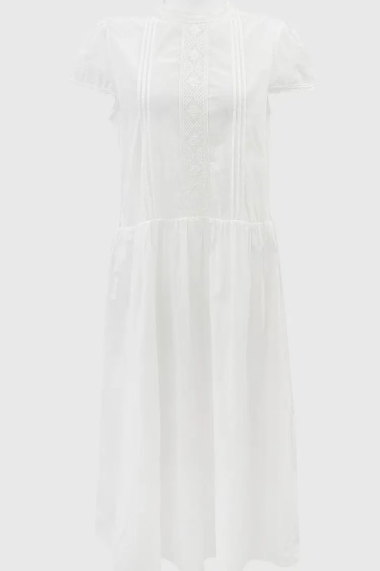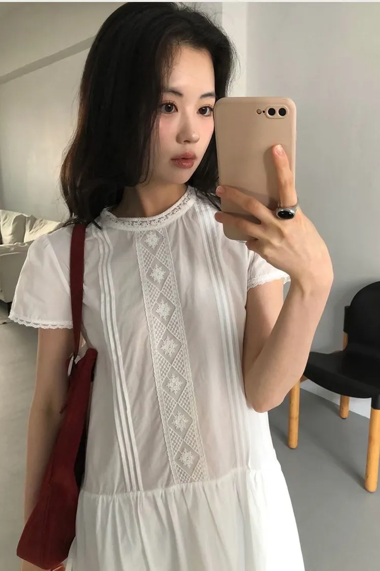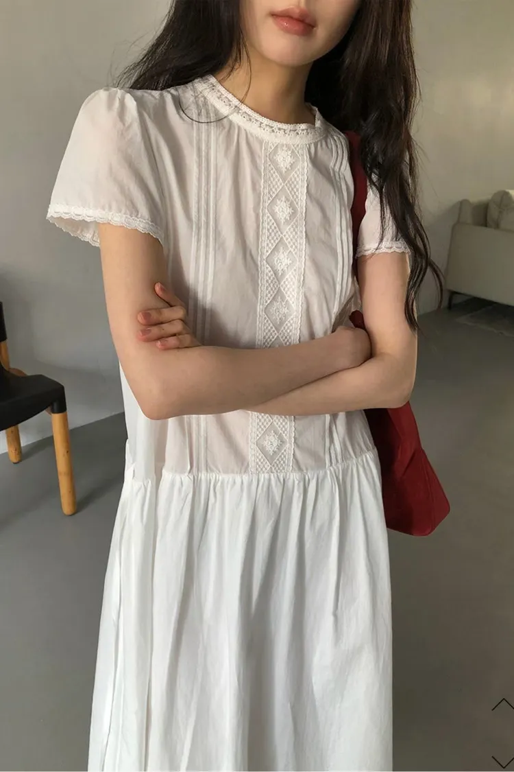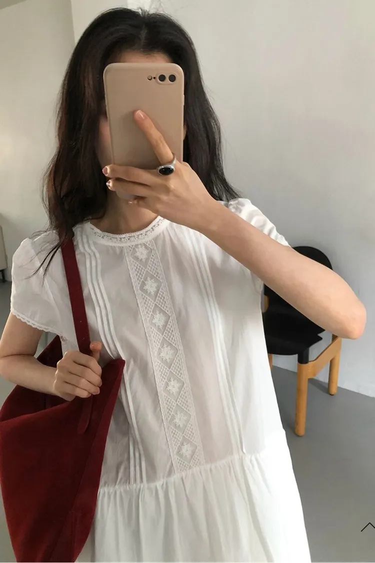 精緻菱格刺繡:胸前與排釦處的刺繡細節,增加了層次感,讓純白洋裝在近看時充滿驚喜。