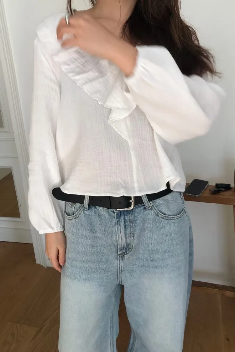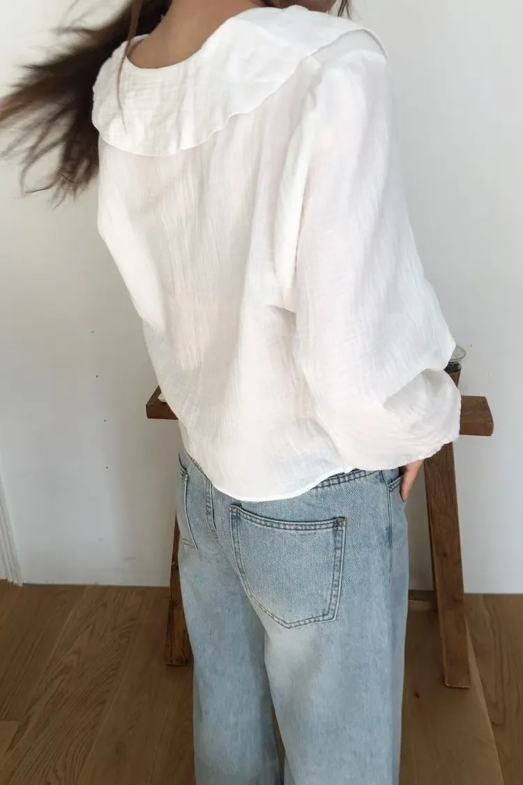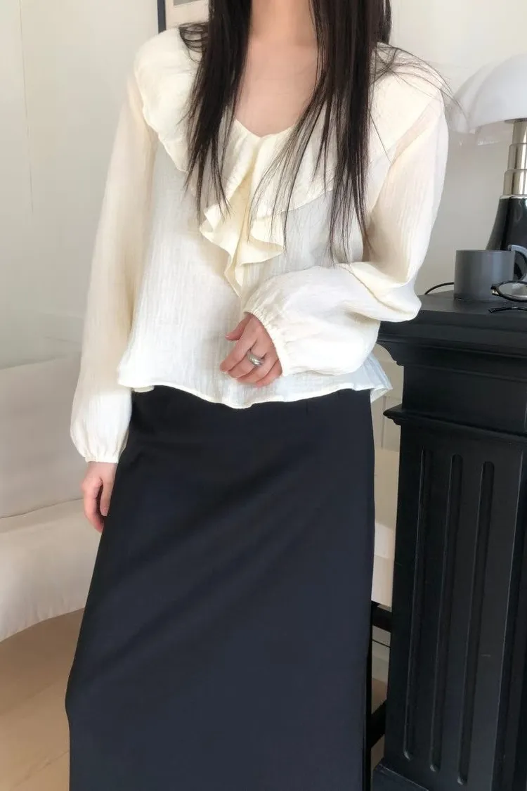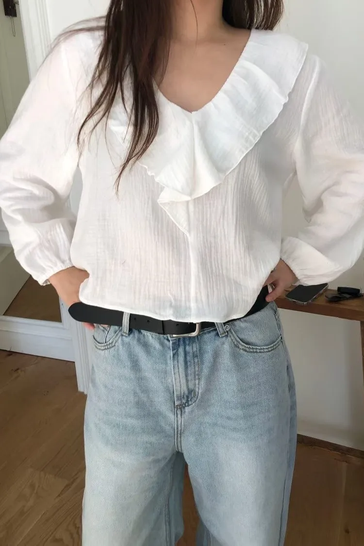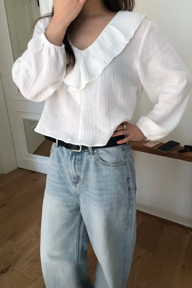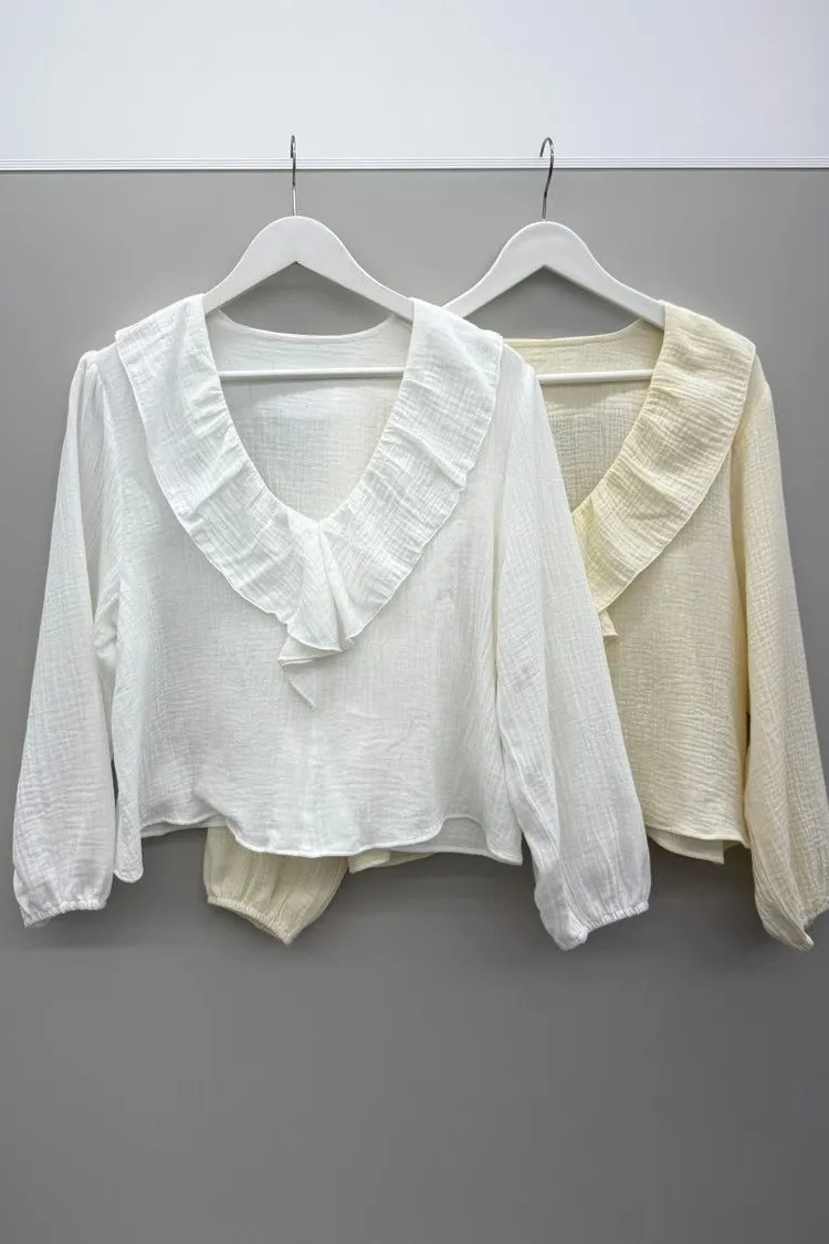 除了經典的純淨白,我們還為這款上衣選了最溫柔的「質感杏」。 這款杏色帶有一點點奶油調,穿上後膚色會顯得非常柔和,是那種高級感十足的色澤。 ✨ 妳不能錯過的細節: 壓縐空氣感面料:杏色更能突顯布料細微的立體壓縐,讓整件衣服看起來更有份量感與層次。 修飾感大翻領:大 V 領荷葉邊修飾臉型,就是最完美的質感生活配色。