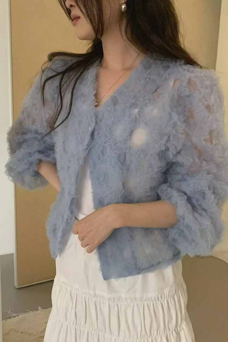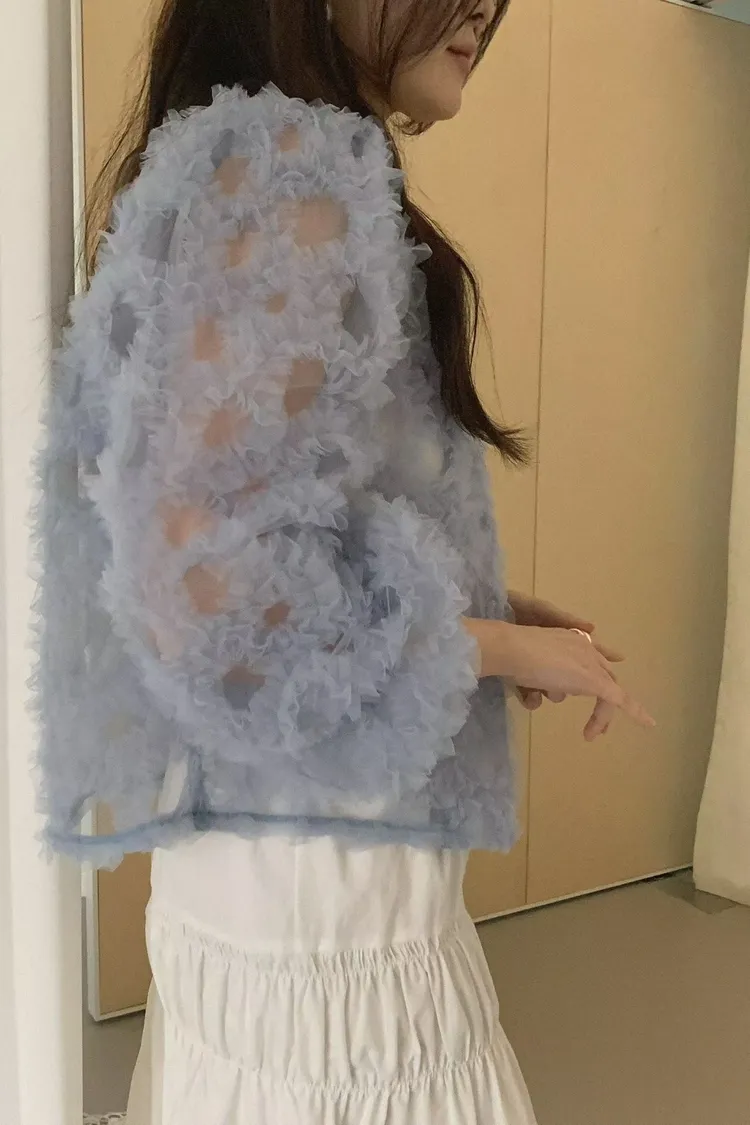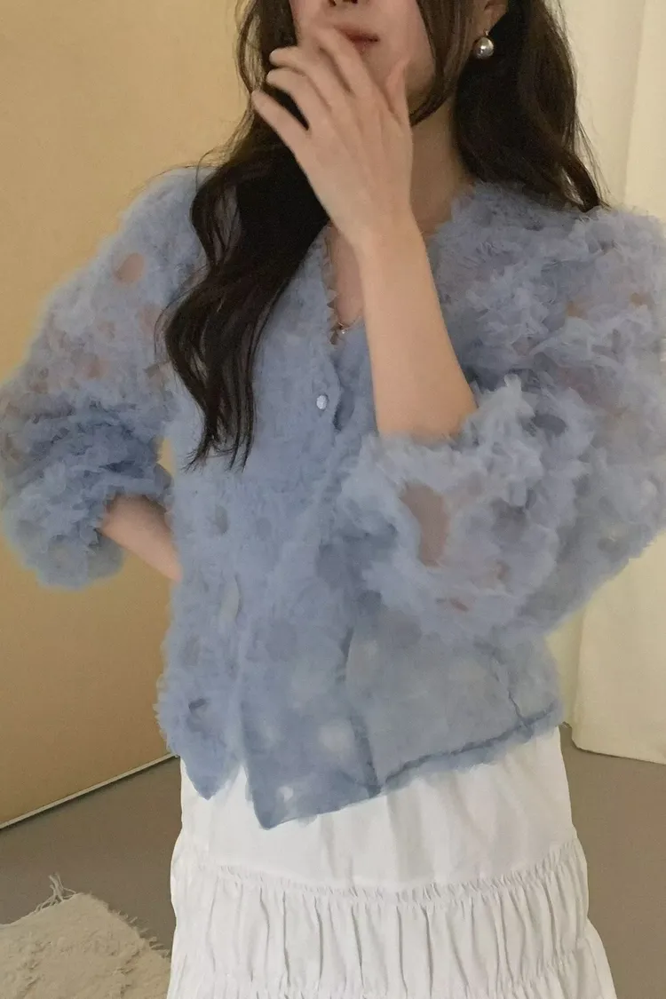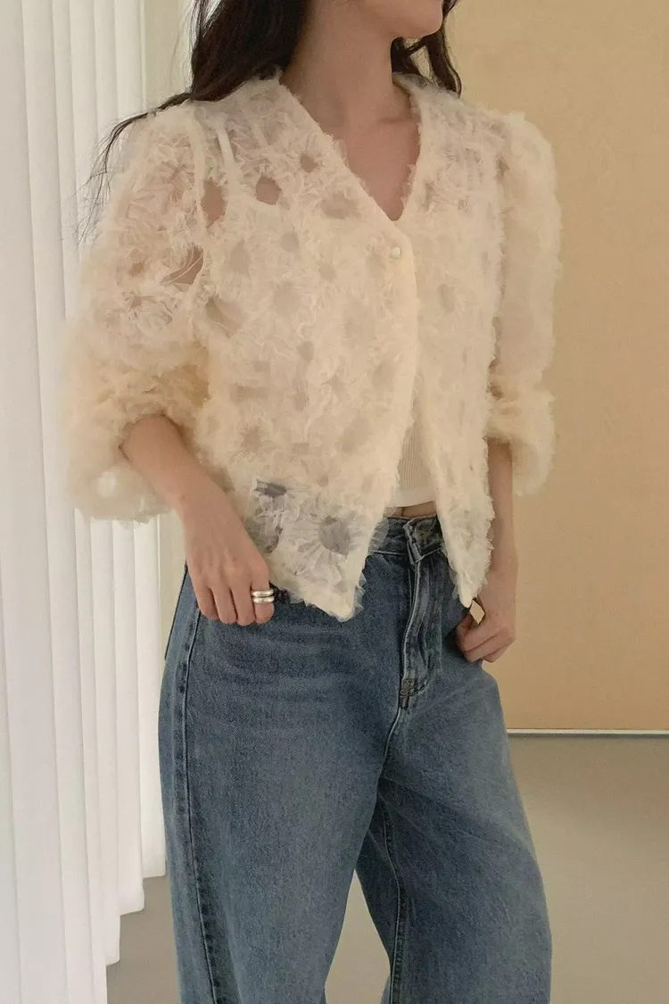 羽翼微光~立體羽毛感圓領排釦罩衫