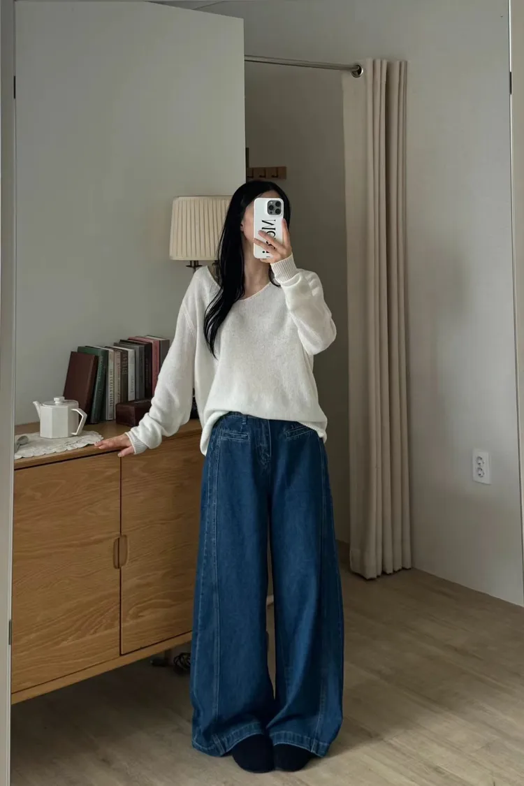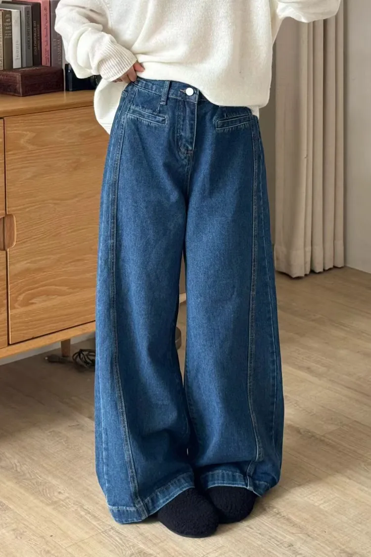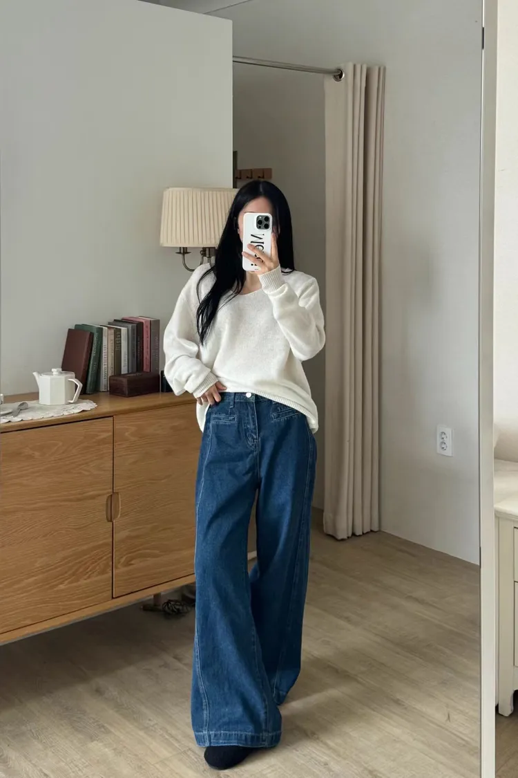 口袋修身牛仔寬長褲