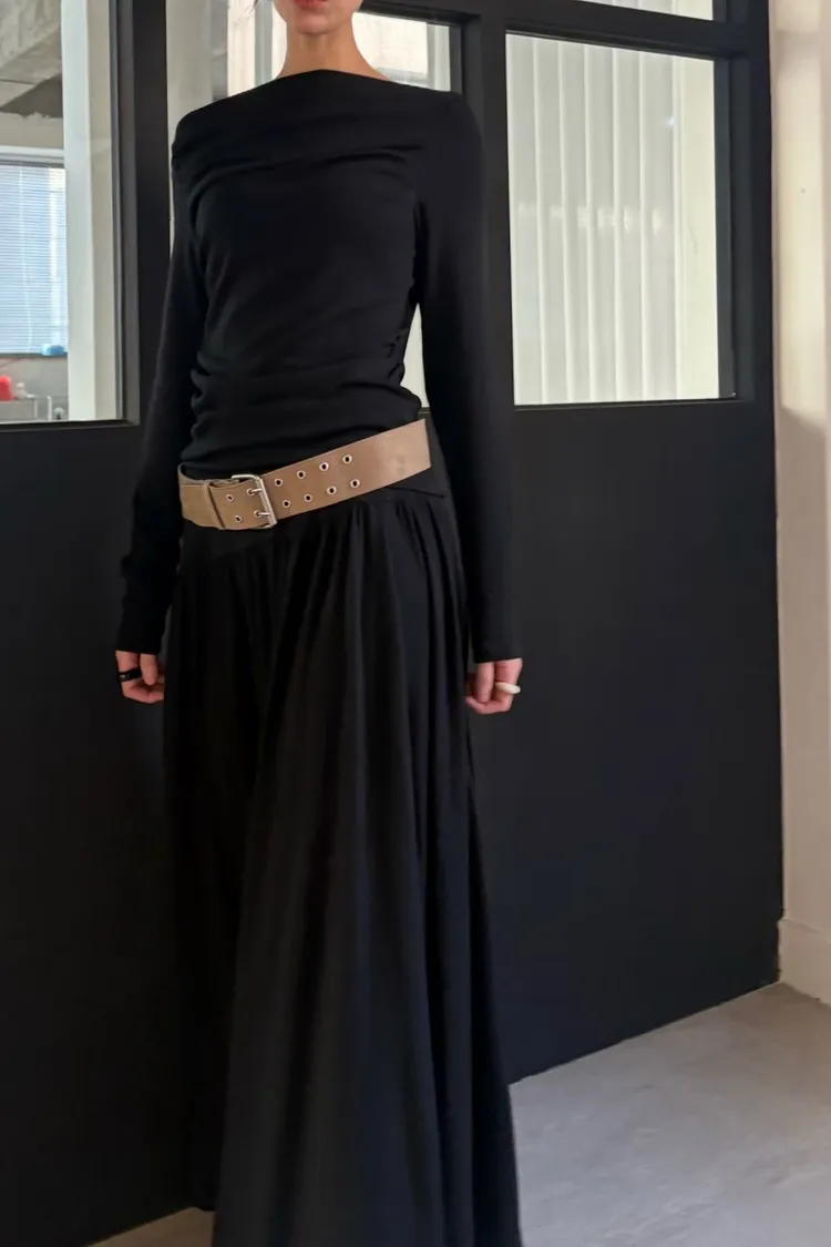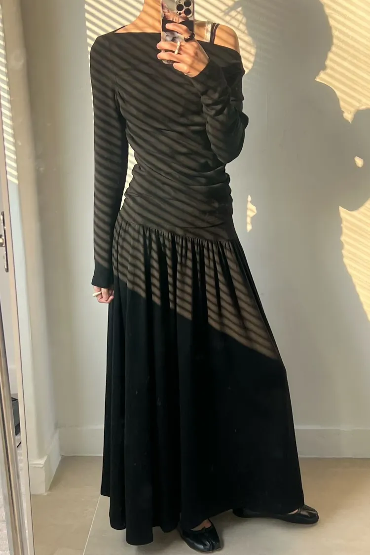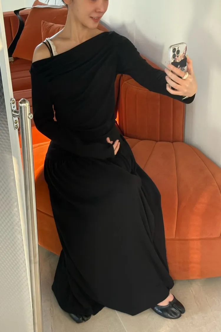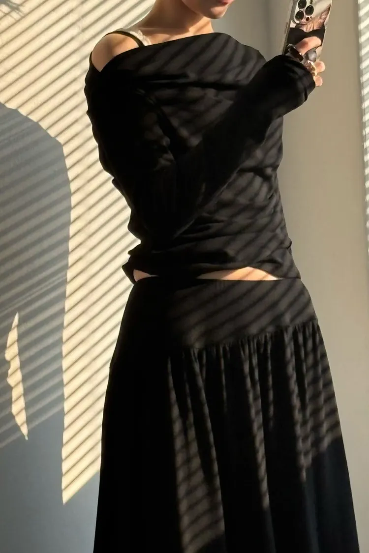 單肩上衣搭配長裙的兩件式套裝