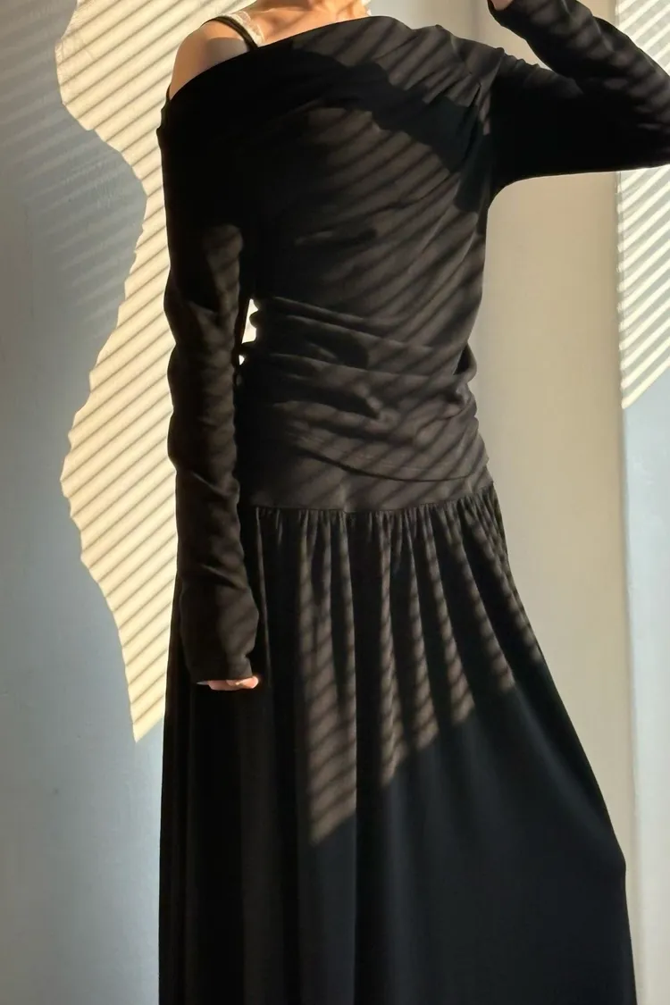 早春~斜肩棉長袖連身裙