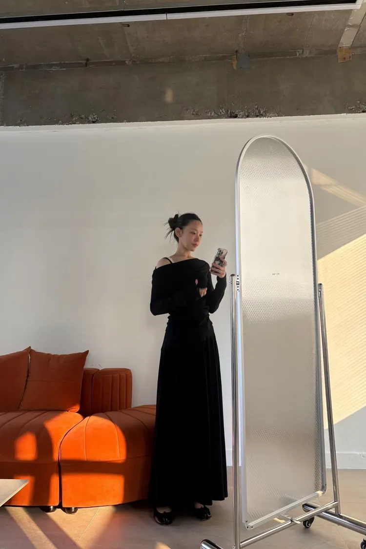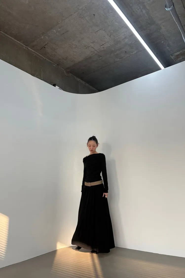 裙子則為寬鬆的垂墜感長裙,營造出修長的視覺效果