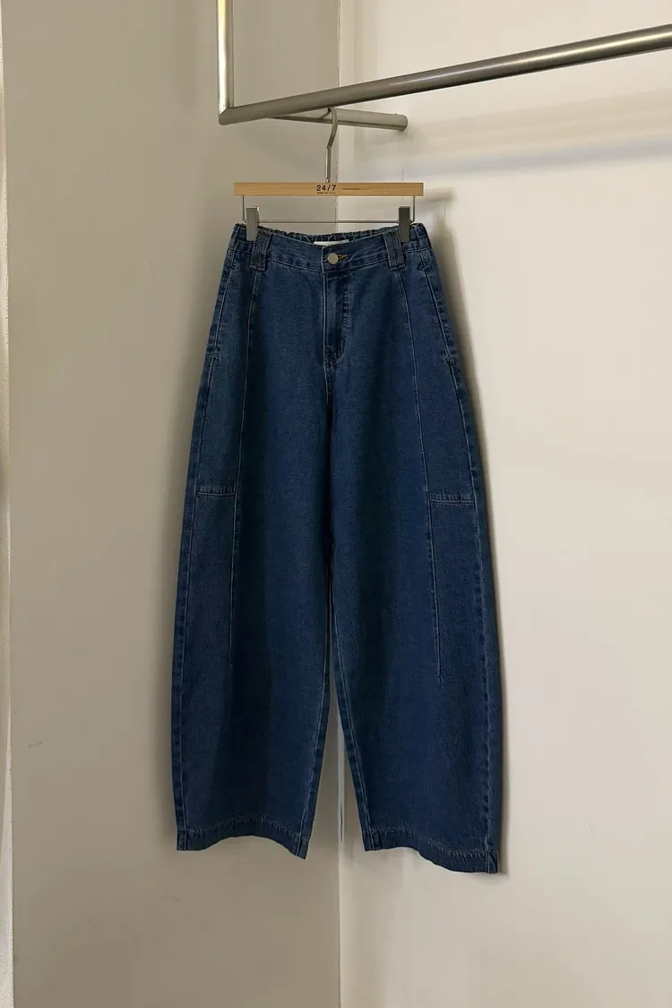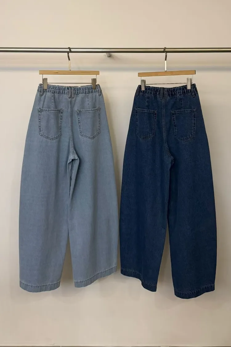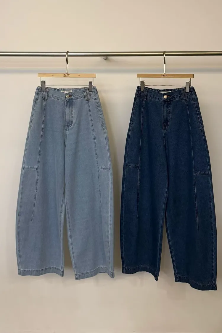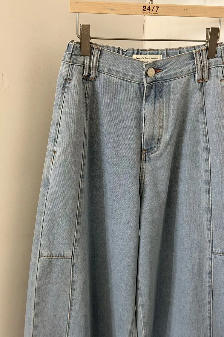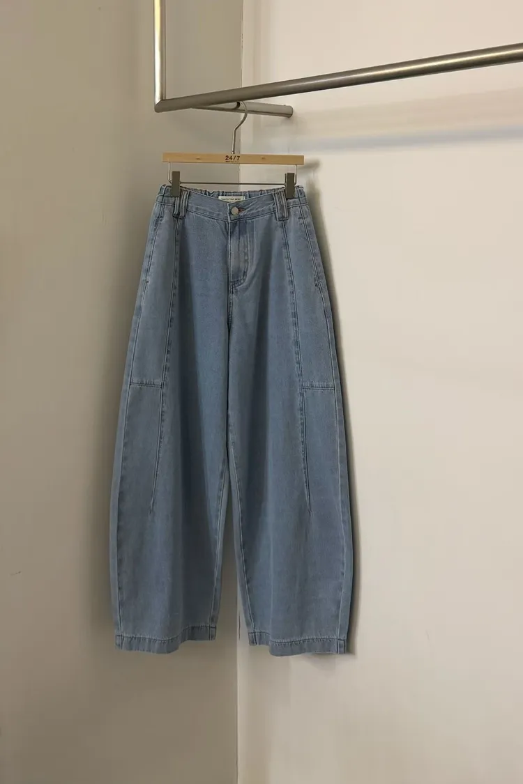 寬鬆的直筒剪裁,褲管從臀部以下自然垂墜,營造出休閒且具現代感的輪廓。 屬於高腰設計,能修飾身形比例. 還有大家喜歡後鬆緊帶褲子前方有明顯的垂直車縫線,增加了結構感和設計細節。淺藍色水洗丹寧布料,適合日常休閒穿搭。